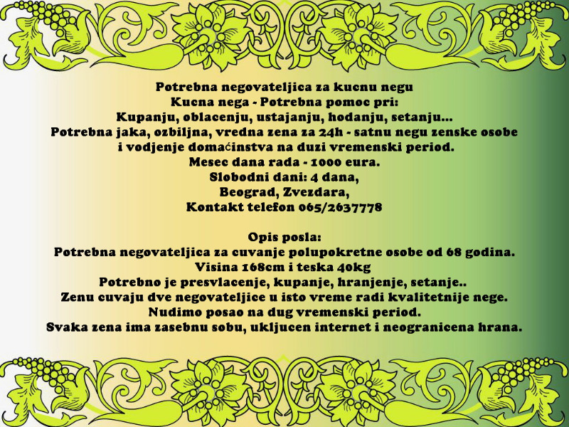 Potrebna jaka, ozbiljna, vredna zena za 24h - satnu negu zenske osobe i vodjenje domacinstva na duzi vremenski period.